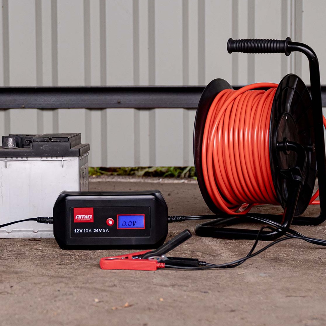Cyfrowy prostownik AMiO to profesjonalne urządzenie przeznaczone do ładowania akumulatorów kwasowo-ołowiowych: WET, AGM i GEL, zarówno w pojazdach osobowych, jak i ciężarowych. Dzięki wysokiemu prądowi ładowania 10 A i możliwości obsługi napięć 12V i 24V, prostownik zapewnia szybkie, bezpieczne i efektywne uzupełnianie energii akumulatorów. Podstawowa ładowarka z funkcją podtrzymywania napięcia i automatycznej regeneracji zasiarczonych akumulatorów. Optymalna do ładowania akumulatorów samochodów osobowych o każdej pojemności oraz samochodów ciężarowych.